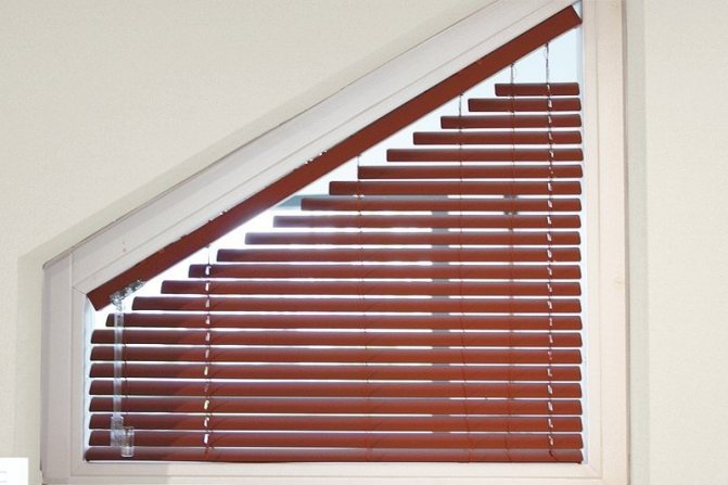 Les stores horizontaux inclinés sont spécialement conçus pour être installés sur des cadres de fenêtres inclinés ou biseautés, en tenant compte de toutes les caractéristiques et nuances de ces fenêtres. Des deux côtés, ces produits sont pourvus de câbles qui les maintiennent parallèles au verre à n'importe quel angle d'inclinaison du cadre.