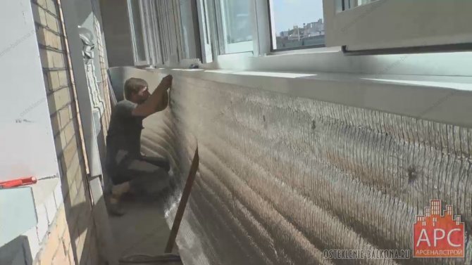 Des feuilles isolantes sont fixées entre les lattes de la caisse et recouvertes d'un matériau d'étanchéité sur le dessus. Les coutures sont scellées avec une feuille métallique. L'isolation du parapet de la loggia se fait dans le processus de vitrage chaud du balcon. Ce n'est qu'après que les cadres et le rebord de la fenêtre sont installés que les pentes sont fixées.