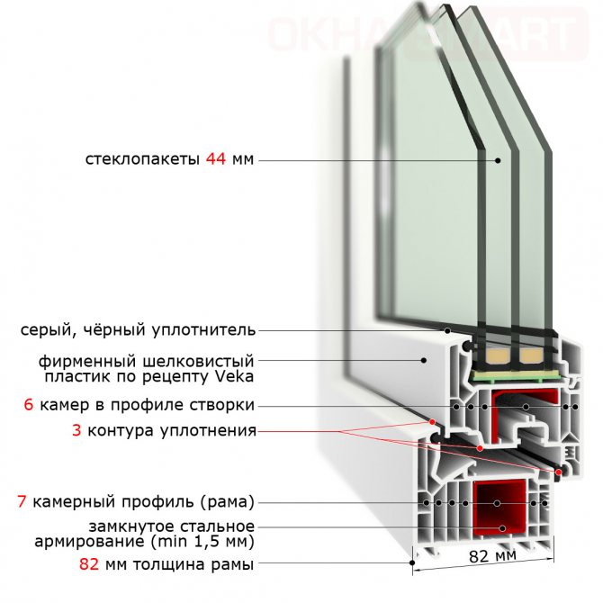 Selon GOST 30673-99 "Profilés en PVC pour blocs de fenêtres et de portes" en termes de résistance au transfert de chaleur (perte de chaleur) est un profil de la plus haute classe 1, car sa résistance au transfert de chaleur est de 0,82 m2 ° C / W