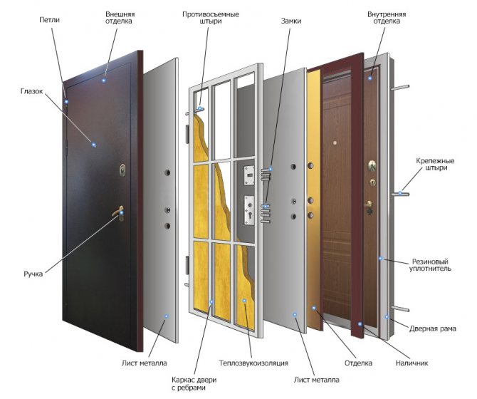 Pour réduire le poids total et, en même temps, donner une résistance significative au produit, des raidisseurs sont placés à l'intérieur, entre les deux tôles principales. Entre eux, dans la plupart des cas, pour améliorer l'isolation phonique et thermique, les fabricants mettent du polystyrène ou de la laine minérale.