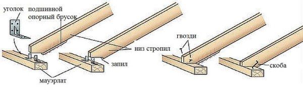 Les méthodes de fixation des pieds de chevron au Mauerlat ou, comme dans ce cas, à la poutre latérale sont illustrées dans la figure ci-dessous. Pour faciliter le montage d'un élément lourd, une planche (barre) tenace est clouée au chevron par le bas, ce qui limite son mouvement: la planche repose contre le bord et ne lui permet pas de tomber en dessous.