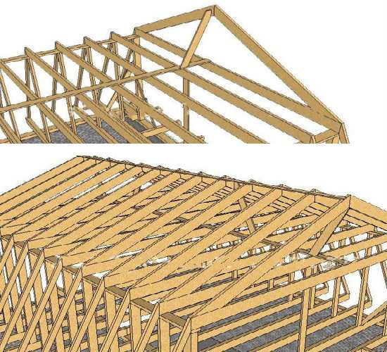 La deuxième méthode - la construction d'un toit en pente est effectuée séquentiellement en collectant des éléments directement sur place. Cette méthode est plus pratique si la structure est grande et une fois assemblée, elle ne peut être soulevée qu'à l'aide d'un équipement spécial (grue).
