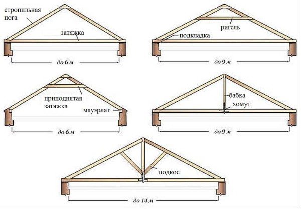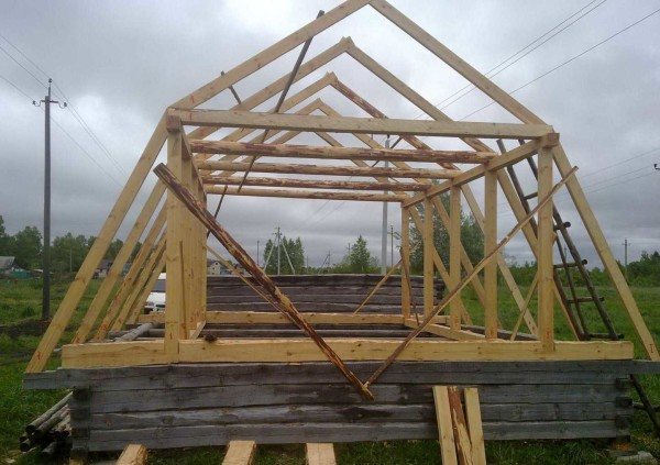 Pour un petit bâtiment en termes de dimensions, la charpente du toit peut être généralement simple: en haut, il y a deux pieds de chevrons suspendus, un serrage, des poutres de plancher, des crémaillères et des chevrons latéraux (photo ci-dessous).
