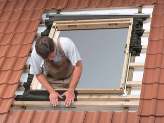 Avant d'installer le cadre, il est nécessaire de retirer la vitre et le solin. Les supports de montage sont placés sur la boîte. Il est important de se rappeler que les modèles de différents fabricants peuvent avoir des formes différentes et sont fixés de différentes manières: uniquement sur des chevrons ou sur des chevrons et des caisses. Un matériau isolant est attaché à la partie supérieure de la boîte, qui est ensuite pressée contre le bois. Une fois le bord inférieur ajusté, serrez fermement les supports inférieurs.