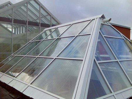 L'une des exigences pour les structures installées sous le toit est le faible poids. Souvent, ils se composent d'une unité à double vitrage à 1 chambre avec quatre types de verre: poli à chaud (verre flotté), avec un revêtement métallisé transparent, trempé et triplex.Le verre thermopoli empêche la distorsion optique. Le verre métallisé réfléchit les rayons ultraviolets.