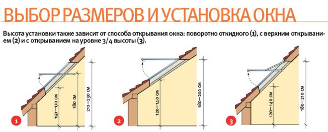 La grande fenêtre vous permet de profiter d'une vue magnifique. Cependant, le choix de la hauteur ne dépend pas que de la beauté. La disposition du toit a un impact majeur. Sur un toit plus plat, un trou plus long est fait. Pour un toit avec une pente de 35 degrés, la longueur optimale sera de 160 cm, pour un toit avec une pente de 70 degrés - pas plus de 120 cm. La longueur est également déterminée en tenant compte que le bord inférieur de la structure doit être à une distance d'au moins 1 m du sol.