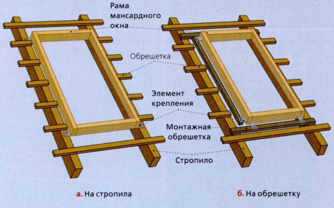 L'installation est réalisée sur une poutre posée en bas, ou des chevrons. Il est important de s'assurer que le dégagement de chaque côté du cadre est d'au moins 3 cm Le cadre est installé à une hauteur de 80 à 130 cm du niveau du sol. Plusieurs facteurs déterminent la hauteur de l'installation: l'emplacement de la poignée, le type de matériau de toiture, les caractéristiques structurelles du toit, les souhaits du client. Si la poignée est en bas, le cadre est placé plus haut, si en haut - plus bas.