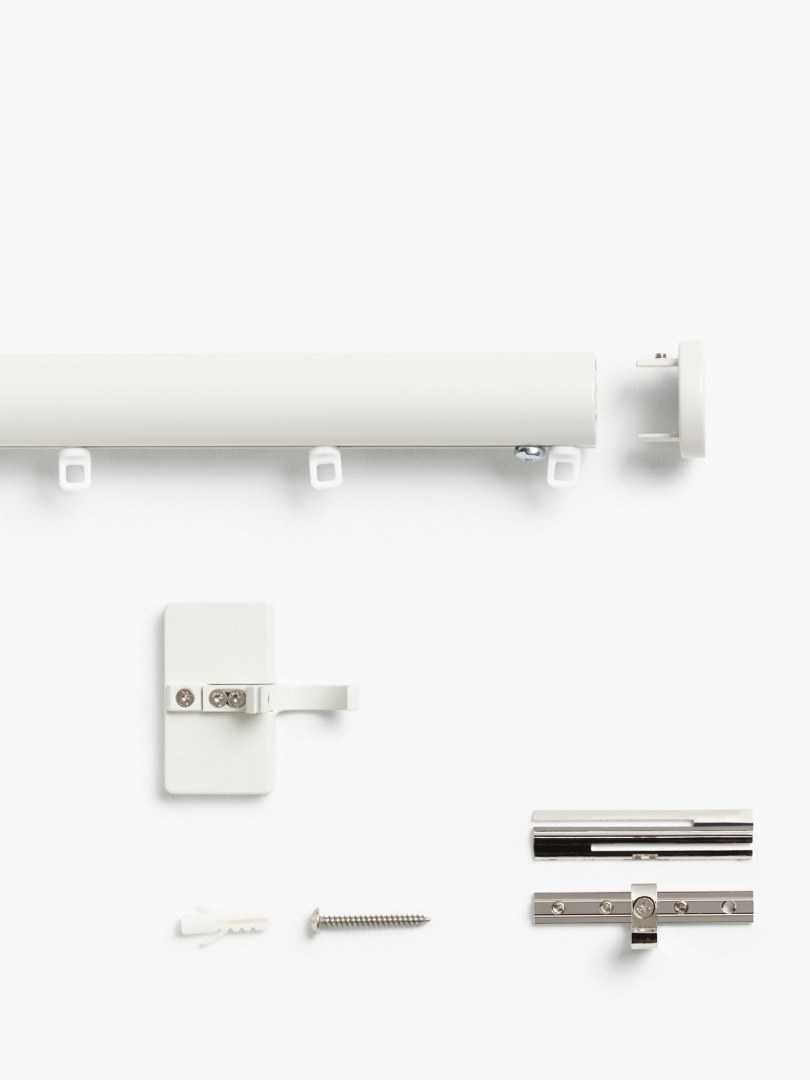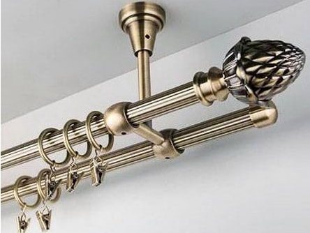 Les systèmes à deux rangées se composent d'une fine bande pour tulle de 10 à 16 mm et d'un tuyau D = 28 mm pour les rideaux occultants. Habituellement, ils sont recouverts d'un film décoratif imitant des matériaux naturels ou de la peinture. Les corniches de 25 mm de diamètre sont en acier inoxydable. Standard L = 160, 180, 200, 240, 280, 300, 320, 360 cm. Vous pouvez également acheter des tiges métalliques solides d'un diamètre de 28 à 50 mm, d'une longueur de 6 m.