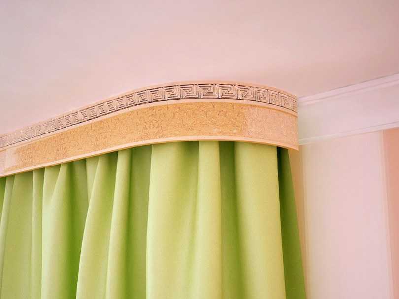 La nouveauté des fabricants est les corniches avec une belle bande ayant une base large, une structure dense et une composition de couleurs vives. Les attaches sont situées derrière la bande, qui cache complètement les anneaux, les crochets, les loquets. Ils utilisent des modèles similaires comme décor supplémentaire.