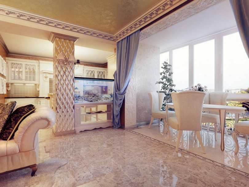 Dans la version ouverte de l'agencement, les corniches de plafond - les dimensions, leur forme, le matériau de construction, jouent tous un rôle décoratif important dans l'intérieur général de la pièce. Ils doivent s'intégrer harmonieusement dans le style choisi.