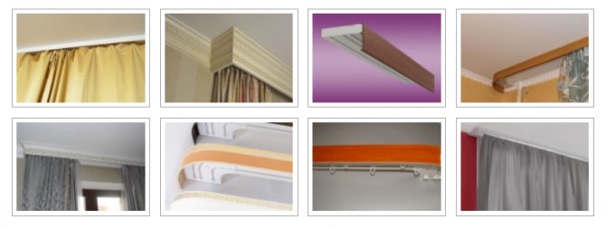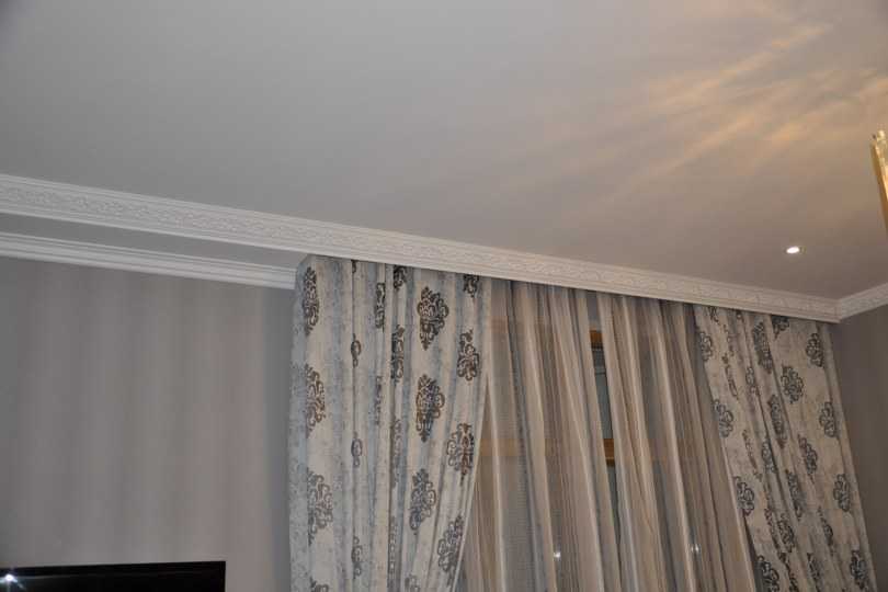 - Pour les corniches de plafond, le meilleur choix serait le placement mur à mur si la pièce est de dimensions standard. Pour les grandes pièces, vous devez être guidé par l'idée générale de conception et être guidé par le fait que le rideau doit faire saillie le long des bords de la fenêtre sur les mêmes 15 à 40 centimètres que les structures murales.