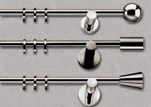 Ces tringles à rideaux sont constituées de divers alliages métalliques (à l'exception de l'aluminium). Ils ont un décor extérieur agréable, une texture de surface brillante. Ils sont sans prétention dans la maintenance, résistants à la corrosion, grâce à la prudence des fabricants.
