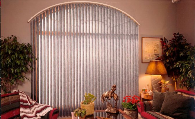 La conception se compose de lamelles de différentes longueurs, qui sont fixées à la corniche à l'angle souhaité. Aussi, pour ce type de fenêtre, les bandes peuvent être fixées à l'aide de crochets spéciaux sans utiliser de corniche.