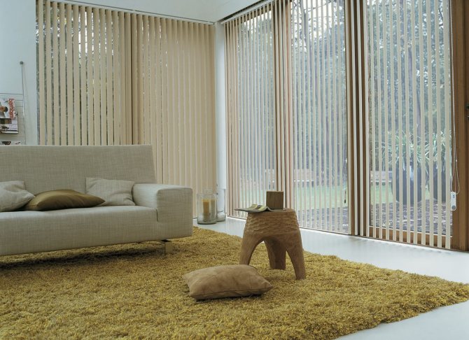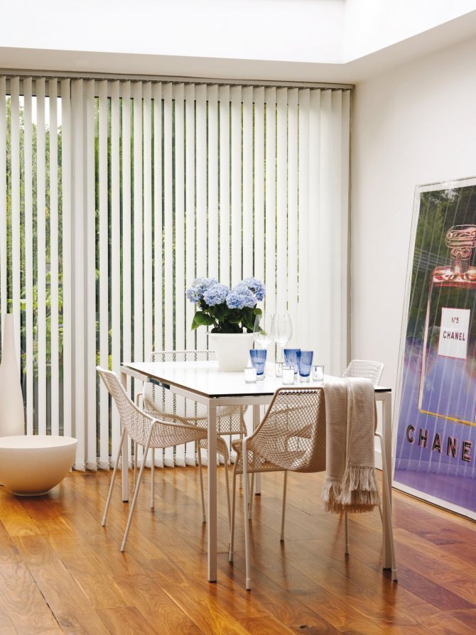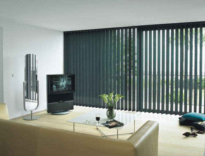 Pour ces grandes fenêtres, les longues lattes verticales sont un choix évident et pertinent. Ils rendront l'espace harmonieux, élégant et moderne.