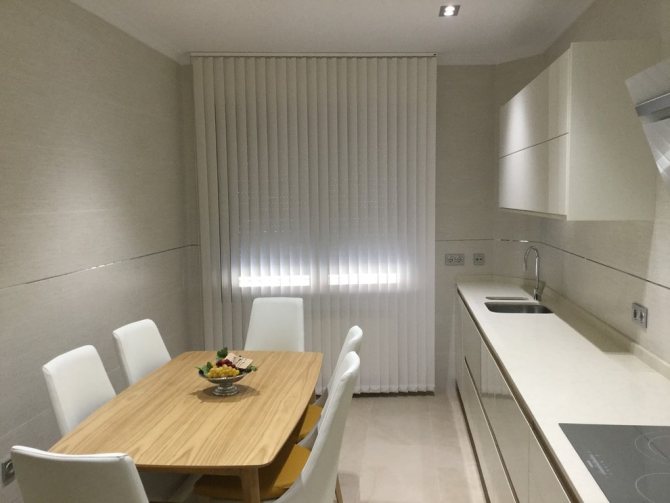 - Résistant aux températures élevées - même sur les fenêtres du côté ensoleillé, il n'aura rien, ainsi que dans les pièces à températures élevées. Par exemple, dans la cuisine à côté d'une source de chaleur. Les batteries chaudes ne l'affectent pas non plus, ce qui est particulièrement important, étant donné que les stores verticaux sont souvent choisis en fonction de la longueur du sol. Vous pouvez même laver le polyester à l'eau chaude, le repasser et le cuire à la vapeur avec un fer à repasser à température moyenne.