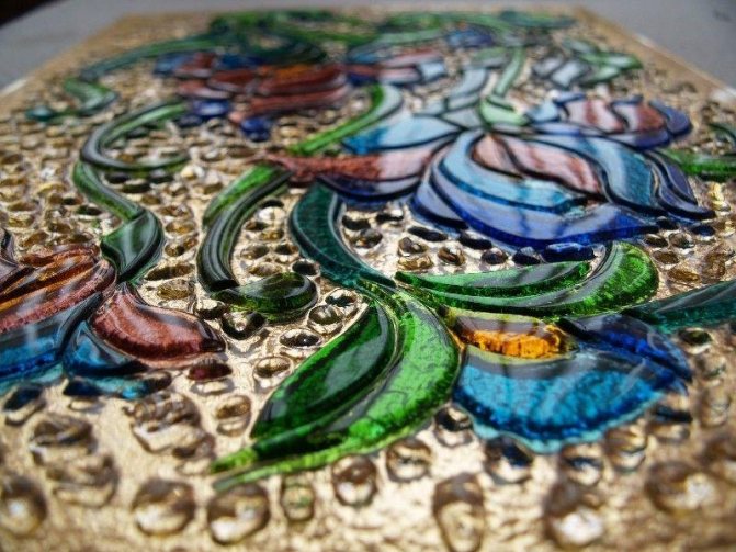 - Cette technique crée une nuance décorative intéressante - or, bronze, noir. Le travail implique l'utilisation obligatoire de gants. La patine appliquée doit être laissée sur le vitrail pendant 15 minutes. Ensuite, le produit est à nouveau lavé et traité avec un antioxydant, protégeant la surface de l'oxydation des coutures. Le vitrail doit sécher complètement, après quoi il est poli avec un chiffon doux. Le vitrail préparé est inséré dans le cadre qui lui est destiné.