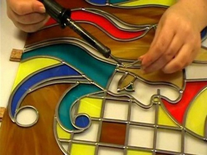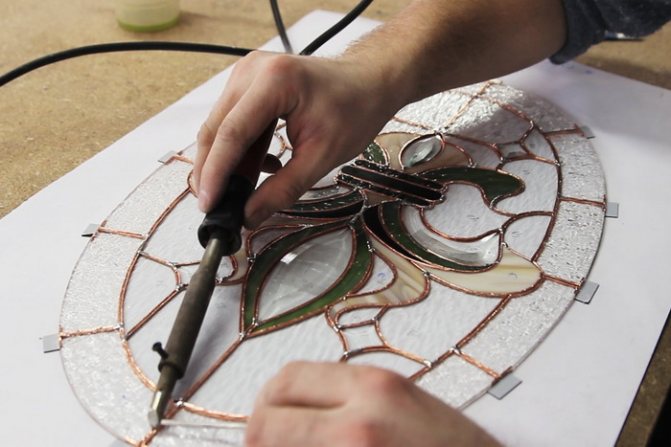 - Après toutes les mesures préparatoires, la soudure commence. Il est recommandé de décorer une ouverture de fenêtre avec un vitrail à l'aide de la soudure POS-61. Le fil d'étain est fondu à l'aide d'un fer à souder spécial pour la production de vitraux. Pendant l'utilisation, l'outil est tenu dans la main comme un stylo à bille. Le long de la couture du vitrail, la soudure est appliquée avec soin et en douceur sans s'arrêter pour éviter la surchauffe du matériau. Après le traitement des pièces, une soudure fine est réalisée à l'aide d'une fine couche d'étain.