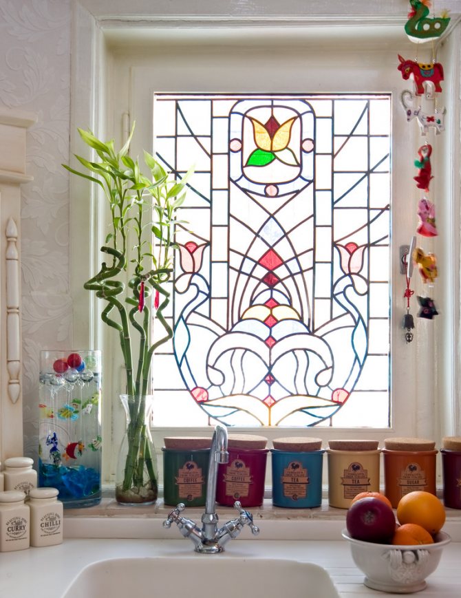 - Le vitrail en mosaïque est le plus fragile, il vaut mieux l'installer dans des fenêtres aveugles. En secouant pendant l'ouverture / la fermeture dans un sac ordinaire, toutes les adhérences peuvent s'effondrer.