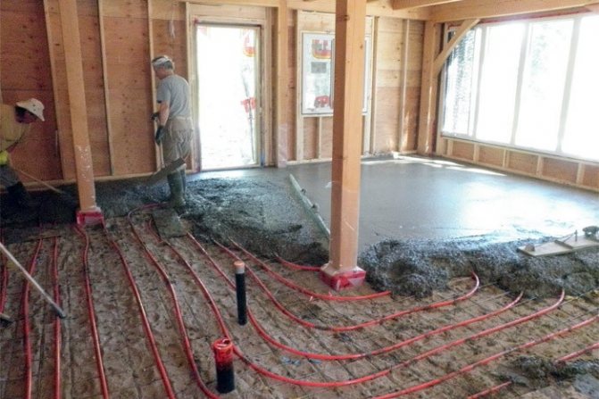 La chape en béton protège les tuyaux des dommages mécaniques et est un excellent conducteur de chaleur des tuyaux au revêtement de sol. Mais pas idéal, l'épaisseur de la chape ne doit donc pas dépasser 5 à 7 cm.