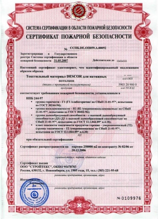 Afin de ne pas vous tromper sur le choix d'un plafond tendu, avant d'acheter, vous devez absolument demander au vendeur des certificats. Les vrais avec des tampons humides, pas des photocopies ou des images d'Internet.