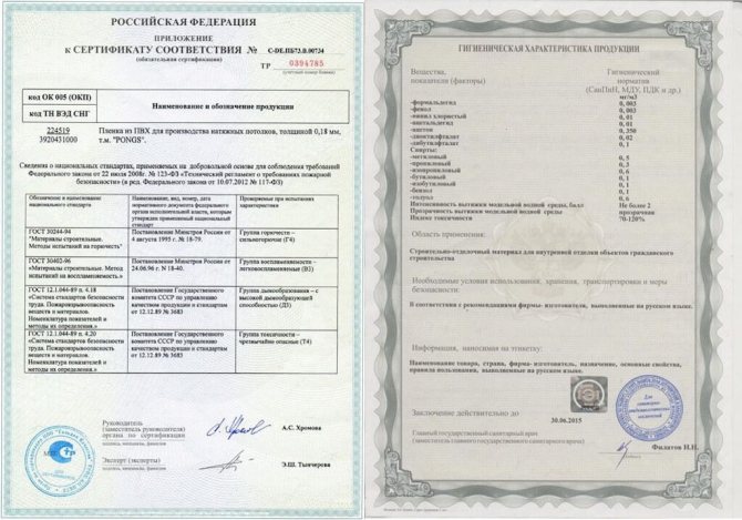 Puisqu'il est impossible de vérifier vous-même le plafond tendu pour la toxicité, la combustibilité et d'autres paramètres, vous pouvez déterminer dans quelle mesure le film est sûr pour la santé uniquement en lisant les informations des certificats.