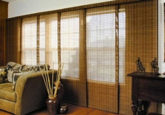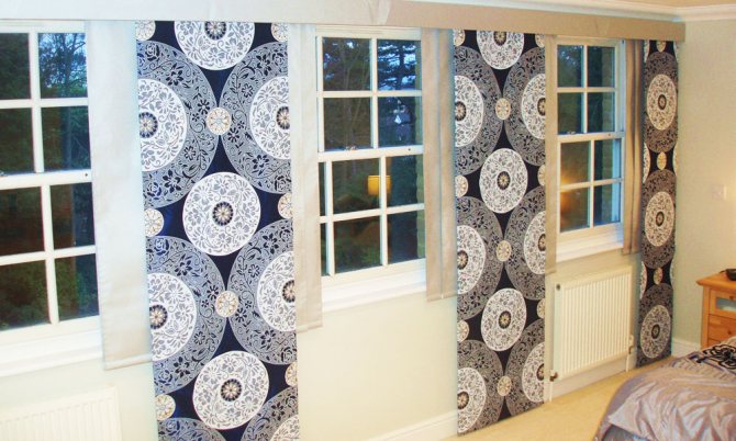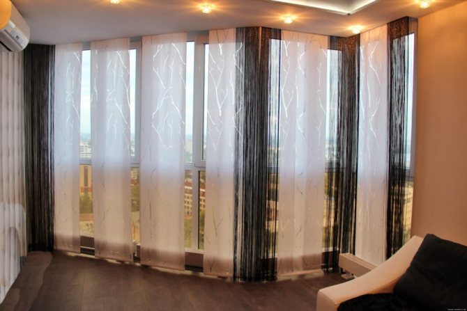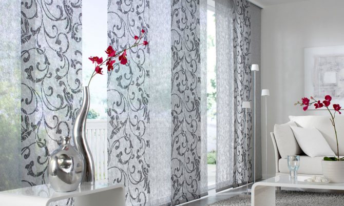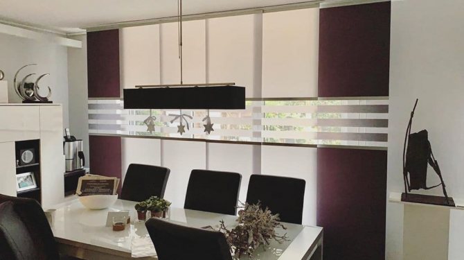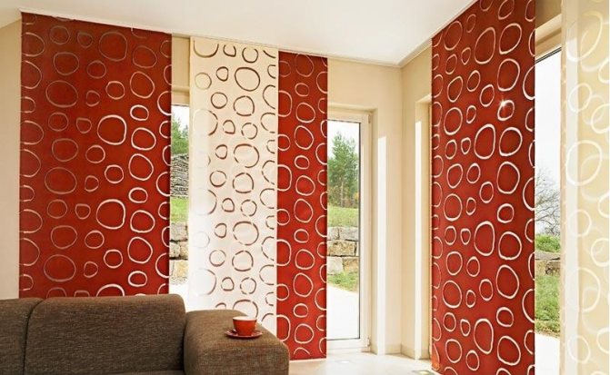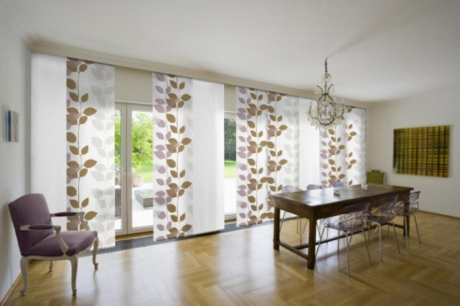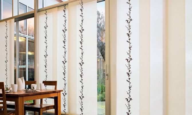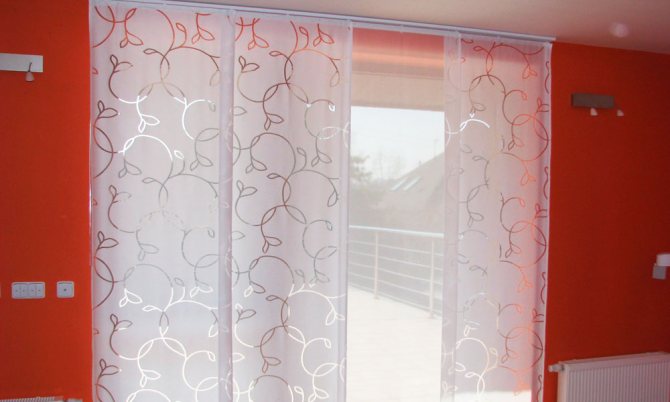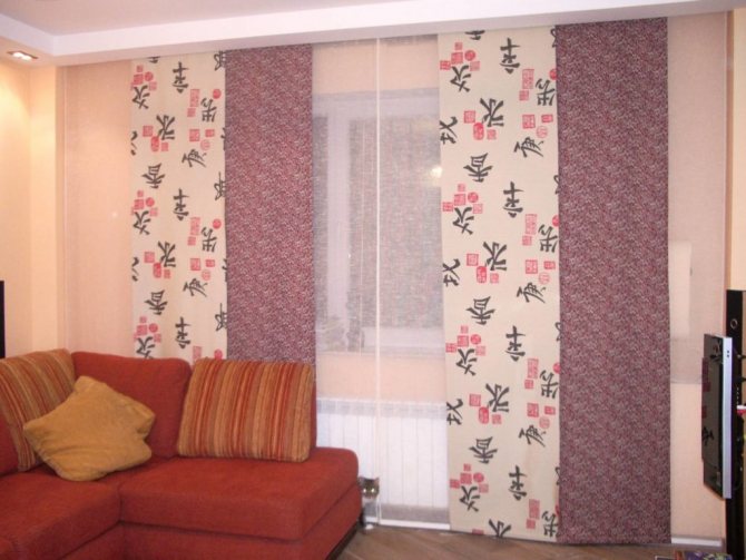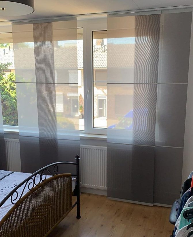 Cela signifie que 7 coupes de tissu sont nécessaires pour une ouverture de fenêtre de 3 m 85 cm. Dans le même temps, ils seront situés légèrement en chevauchement, se couvrant partiellement. Le style japonais permet une telle disposition des segments individuels de ce type de rideau.