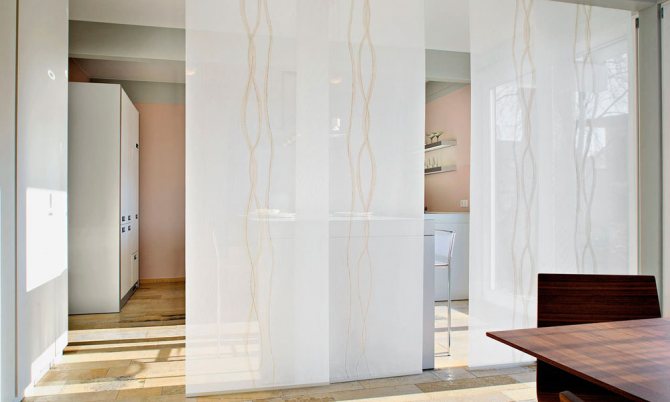 De tels panneaux en tissu conviennent partout: dans la cuisine, dans le salon, sur la loggia et dans la chambre. Par exemple, dans le salon, ils peuvent être utilisés à la fois comme rideaux, drapant les fenêtres avec eux et comme portes, décorant une porte avec des produits similaires.