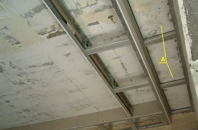 - Un cordon tendu entre les bords inférieurs de la boîte sur les murs aidera à contrôler la déflexion des bords inférieurs. En se concentrant dessus, ils installent des cavaliers verticaux constitués d'un profilé de plafond (PP). Ils fourniront également à la structure la rigidité nécessaire et seront utiles lors de la fixation de cloisons sèches.Par conséquent, le pas entre ces cavaliers est de 60 cm.
