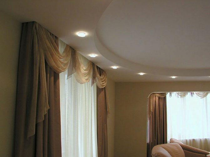 Une niche de corniche en placoplâtre est conçue pour cacher l'endroit où les rideaux sont fixés. Sur la base de la conception des rideaux du salon et de leurs fixations, il existe également une division en profondeur et en fonction.