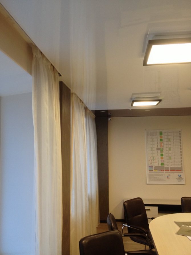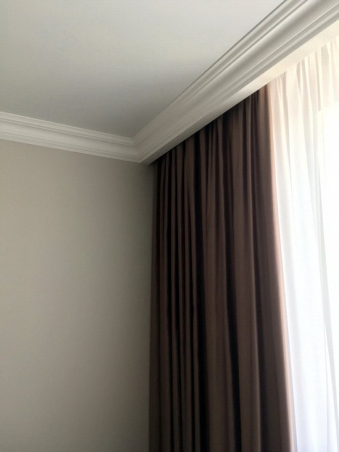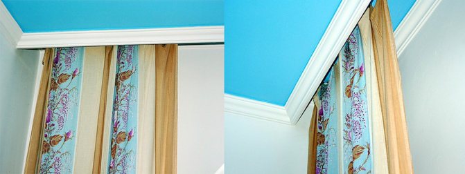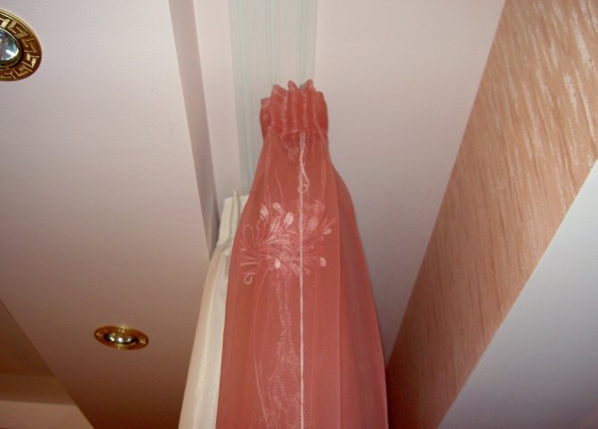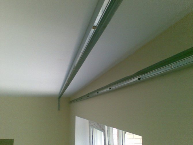 Ensuite, la corniche est montée sur le plafond brut, puis le plafond lui-même est étiré le long de la baguette. Tout est prêt - vous pouvez accrocher les rideaux.