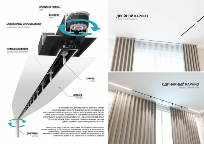 La société met en œuvre la plupart des solutions en utilisant un système amortisseur sans joint, ce qui rend visuellement la structure plus esthétique et plus pratique dans l'installation. Il convient de noter qu'un tel système de corniche est une solution innovante dans le domaine des plafonds tendus: grâce à lui , il est devenu possible d'encastrer la corniche dans le plafond sans utiliser de profil supplémentaire et l'installation de niches. Entre autres choses, la corniche peut être complétée par un entraînement électrique et contrôler le mouvement des rideaux à l'aide d'un bouton, d'une télécommande ou d'un smartphone, car le système «maison intelligente» gagne aujourd'hui en popularité dans le monde entier et devient un attribut indispensable en chaque pièce.