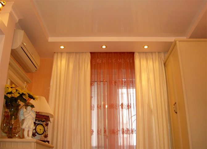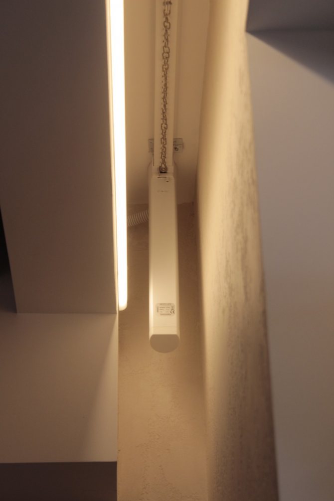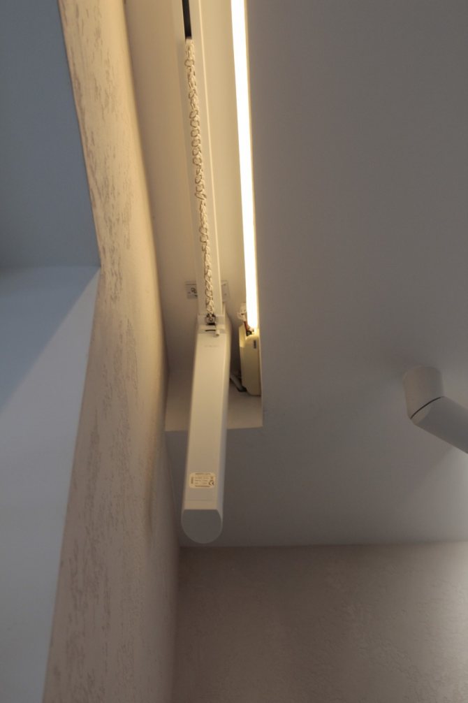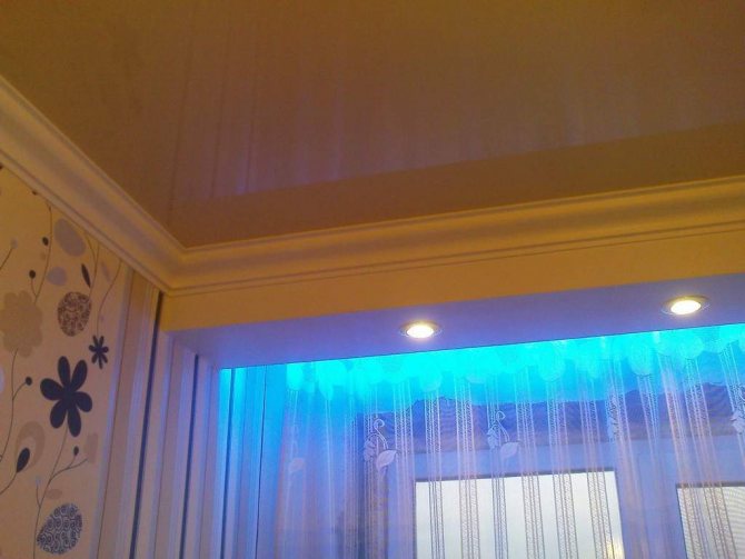 - La conception étroite, de 5 à 7 cm de large, ne permet pas l'installation d'un éclairage supplémentaire, à l'exception de la bande LED pour l'éclairage du rideau. Pour la beauté et la transition en douceur de l'intérieur de la pièce, une baguette est collée. La hauteur de la structure doit être légèrement supérieure ou égale à sa largeur.