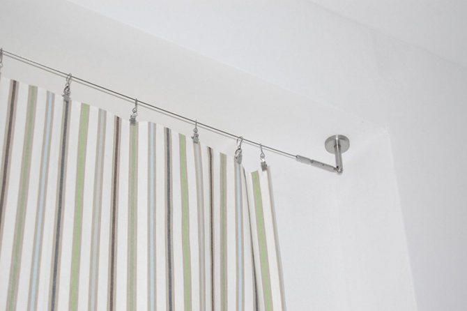 les rideaux de fils s'adaptent sous les rideaux lumineux. Leur dessin est représenté par une ficelle tendue entre deux attaches. La corniche commencera à s'affaisser sous le poids des textiles. Par conséquent, un rideau de ficelle suspendu convient à une cuisine avec un rideau en apesanteur ou à une chambre d'enfants.