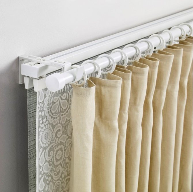 les systèmes de profils sont simples et démocratiques. Cependant, c'est avec eux que la plupart des idées de conception peuvent être résolues. Le design du rideau est représenté par un long profilé en aluminium ou en plastique à plusieurs rangées.Cette fonctionnalité vous permet d'accrocher du tulle, des rideaux sur un seul produit et de compléter la décoration avec des lambrequins.
