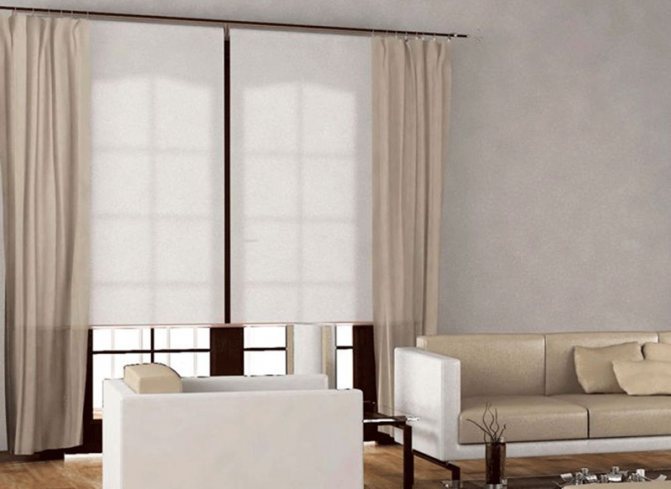 Un système assez populaire, car il s'intègre de manière très organique dans presque tous les intérieurs, pratique et pratique à utiliser. Bien adapté aux pièces qui ont déjà des rideaux ou des tulles.