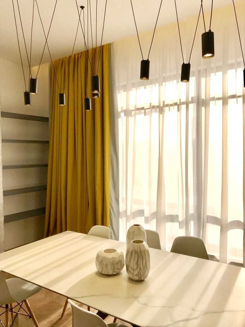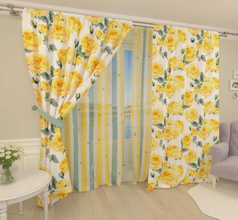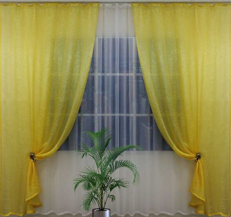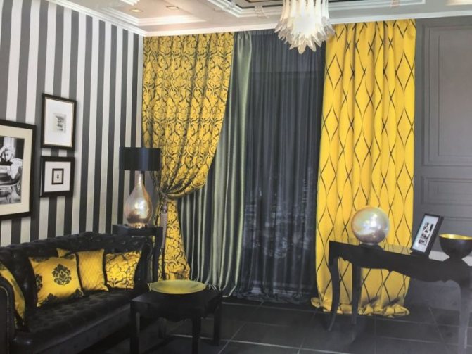 De plus, diverses combinaisons de différents types de rideaux peuvent être utilisées. Par exemple, le tulle jaune transparent, associé à un tissu de rideau jaune, plus saturé d'ombre, a fière allure dans un salon spacieux.