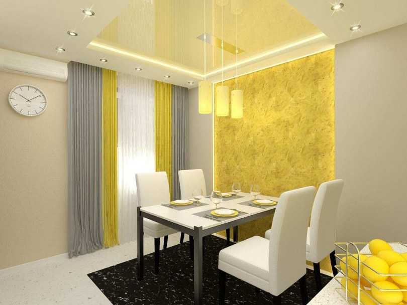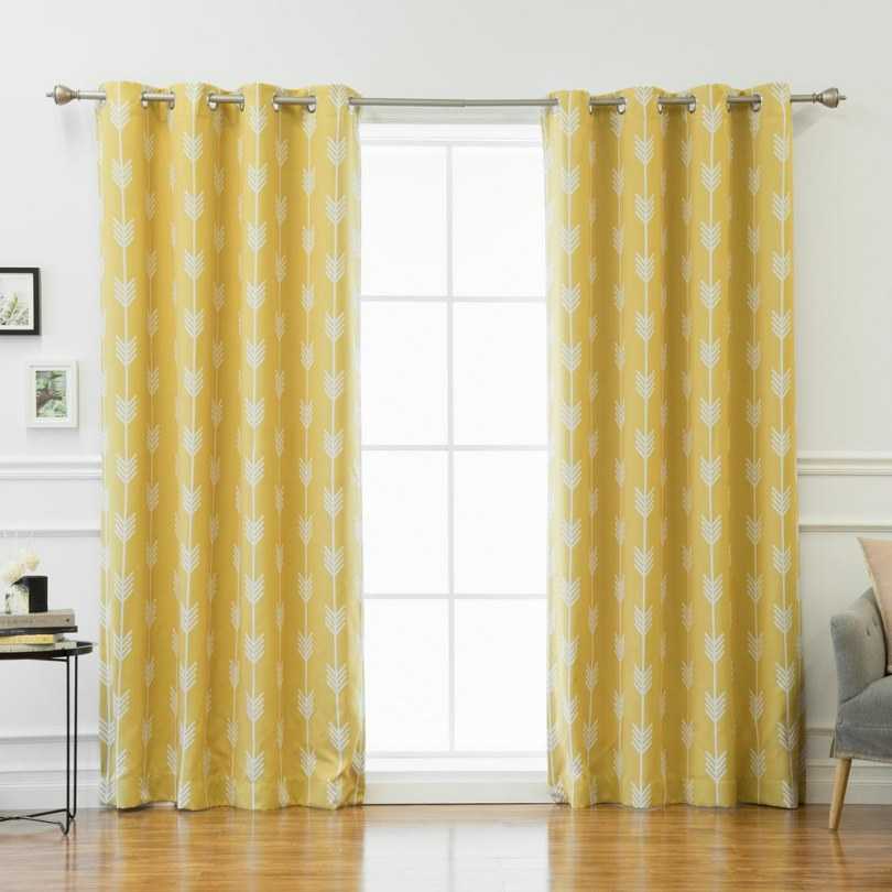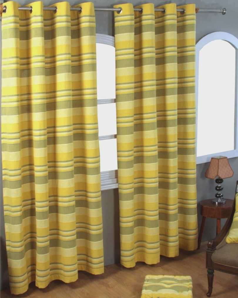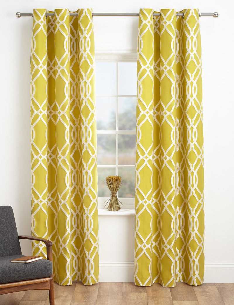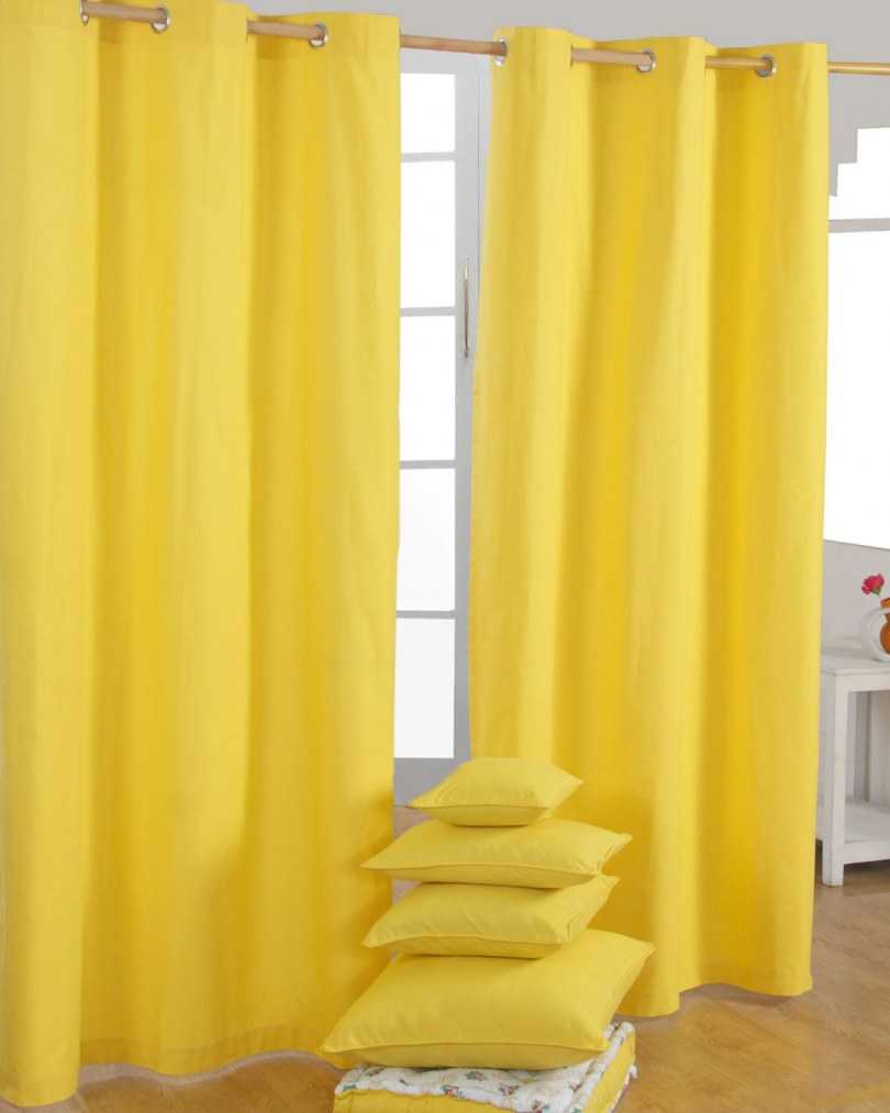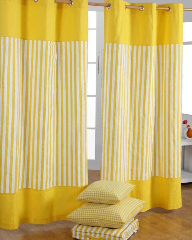 Alors que dans le salon, vous devriez choisir soit un rideau jaune clair uni, soit un rideau jaune avec des motifs floraux.