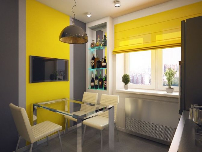 Les options sélectionnées pour l'ensemble du mur, et pas seulement pour la fenêtre, augmenteront certainement visuellement l'espace de la salle. L'essentiel ici n'est pas d'en faire trop avec une abondance excessive de jaune, mais de le diluer correctement avec des tons clairs de vert clair, beige ou bleu.