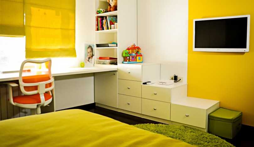 Dans la chambre des enfants, vous pouvez faire attention à la couleur et au motif jaunes. Les photocourts soutiendront l'intérieur dans un thème spécifique et rendront la pièce plus intéressante.