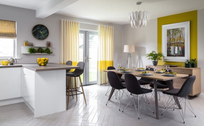Les rideaux jaunes ne peuvent pas être combinés avec des nuances jaunes de murs, de sols, car cela peut causer de la satiété. Et il est préférable de meubler ces pièces avec des meubles de couleurs neutres. L'ajout de tons verts aidera à remplir l'espace de légèreté et de teintes naturelles.