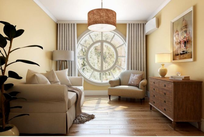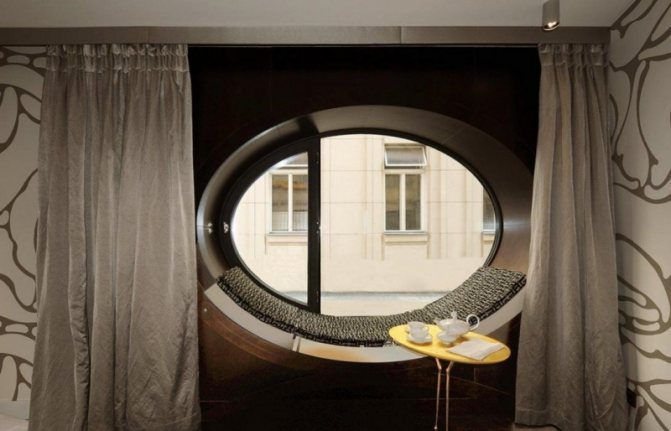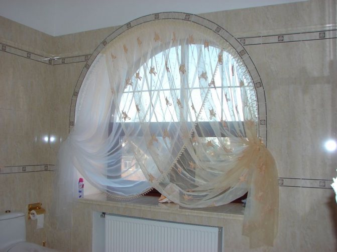 Une solution originale pour les fenêtres rondes - les rideaux plissés, qui peuvent être utilisés pour les fenêtres de toutes formes et tailles géométriques