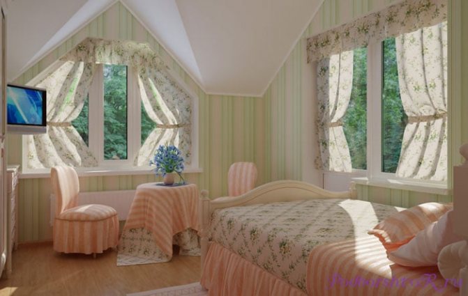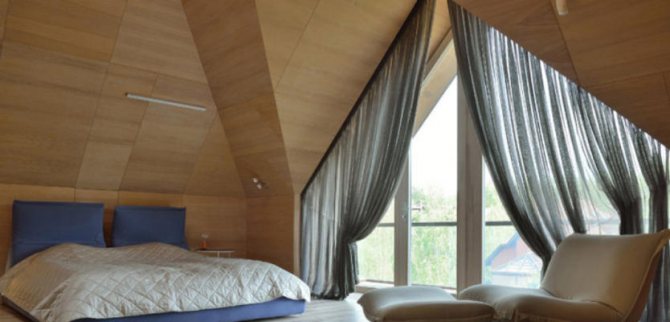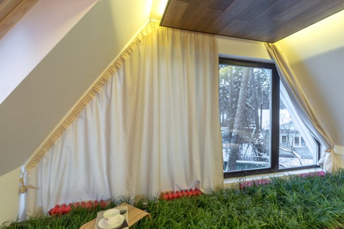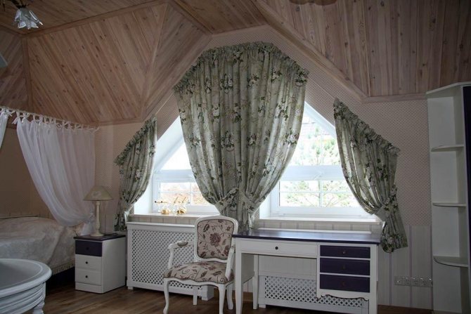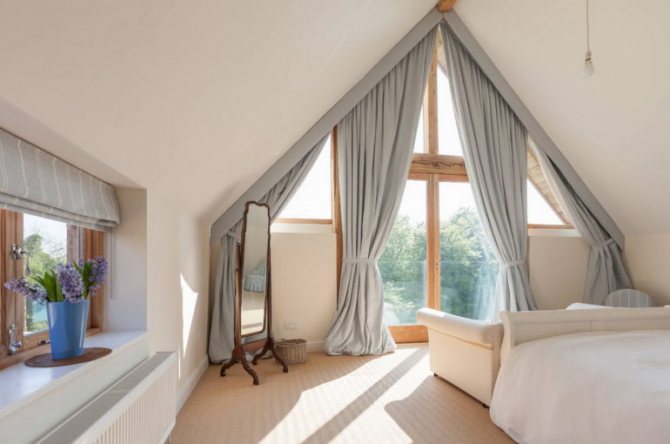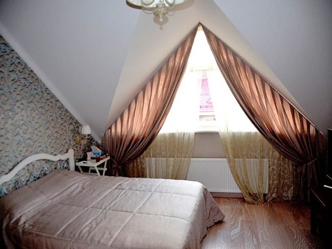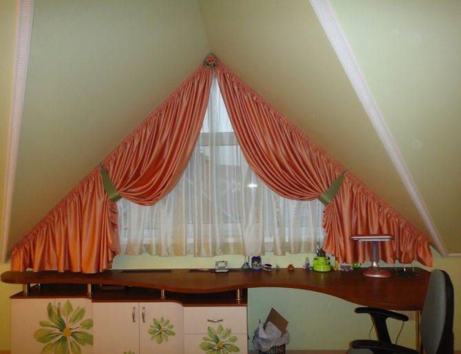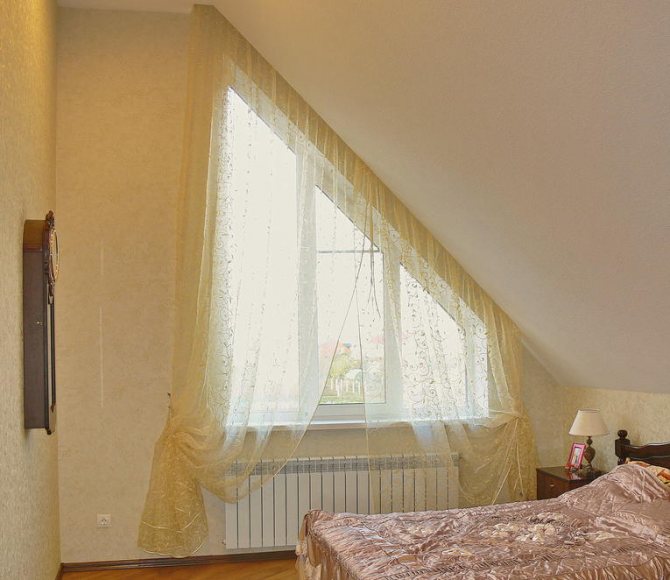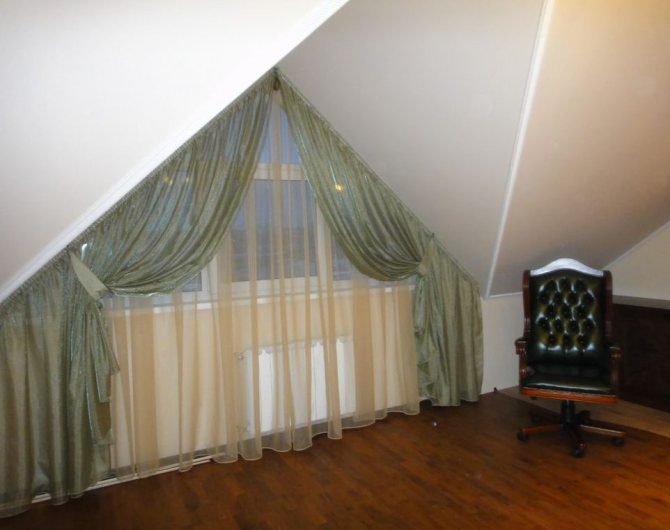Une des conditions pour la décoration réussie d'une pièce avec des rideaux sur des fenêtres inclinées est la conformité de la manière de leur exécution avec les caractéristiques générales de l'intérieur.