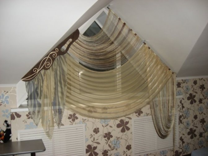Décoration de la fenêtre de toit avec du tulle avec une corniche supplémentaire au milieu