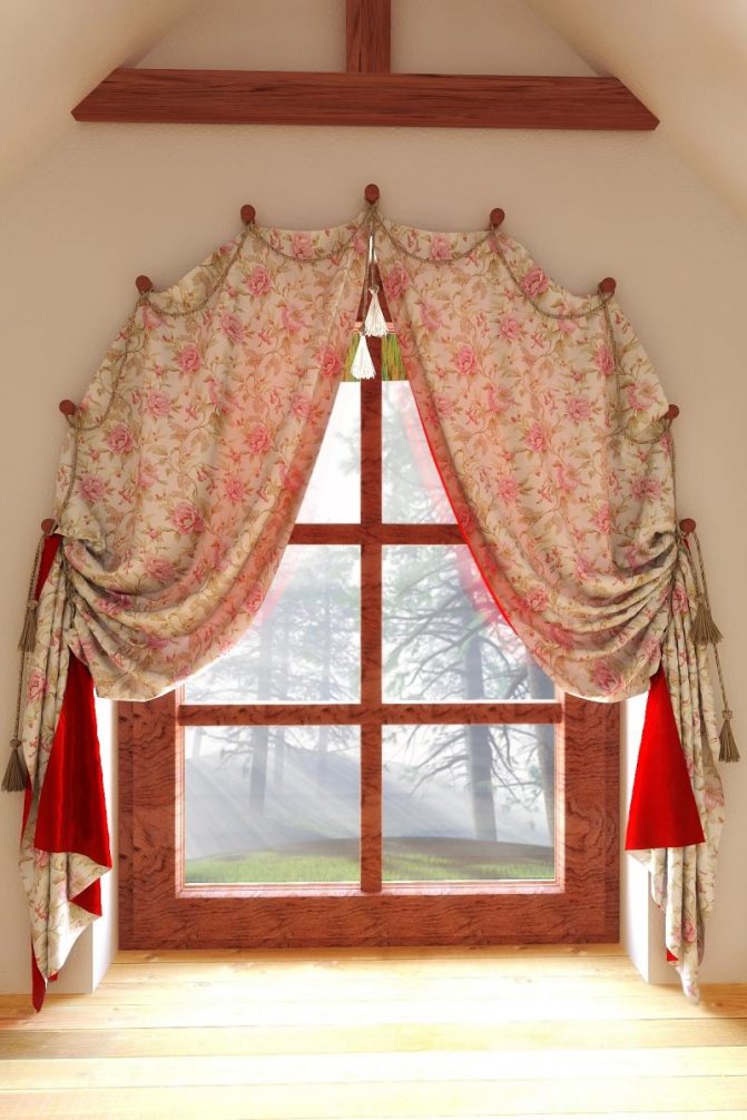 Informations Complémentaires. Pour ceux qui n'ont pas l'habileté de coudre, il est assez difficile de fabriquer un rideau pour une fenêtre triangulaire de vos propres mains; l'aide à cet égard sera fournie par des photos et des classes de maître. Des recommandations sur la façon de coudre un rideau oblique sur une fenêtre, ainsi que des patrons et des schémas de couture, peuvent être trouvées sur Internet.