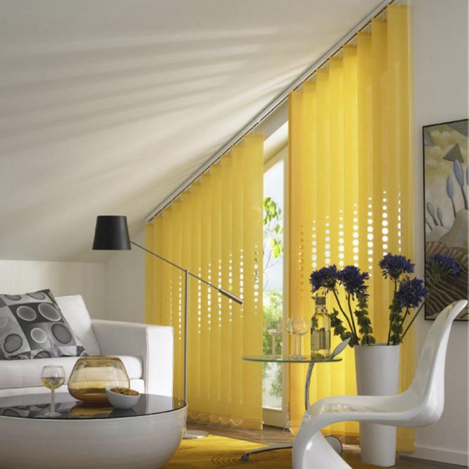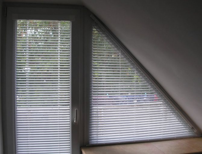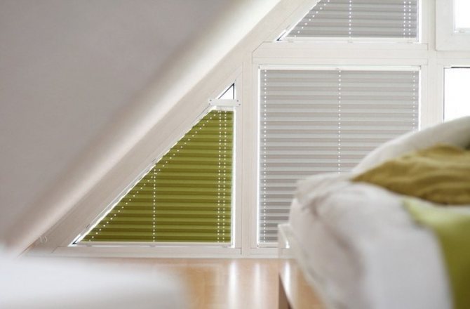 - Les caractéristiques de l'installation des stores dépendent des caractéristiques des fenêtres triangulaires. Les larges sont pratiques à fermer avec des rideaux verticaux en tissu. Une petite fenêtre paraîtra visuellement plus large si des stores horizontaux en PVC sont utilisés pour la décorer. La règle générale est de prendre en compte les dimensions et la géométrie de la structure.