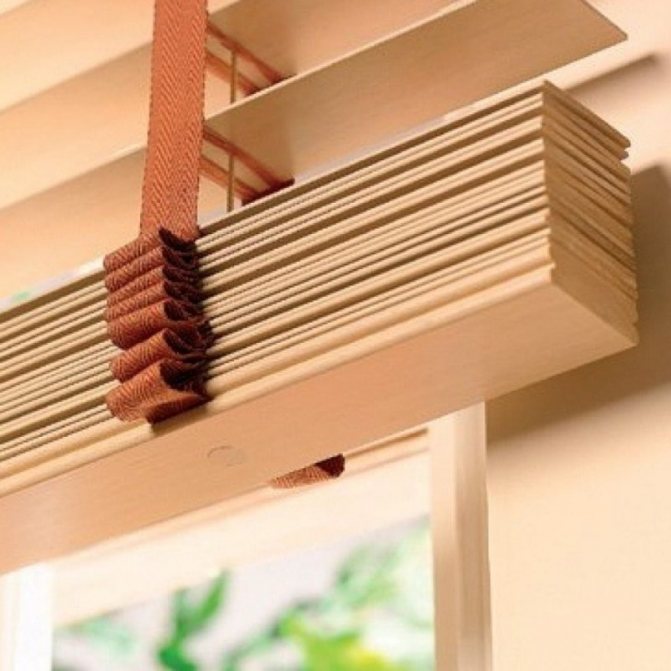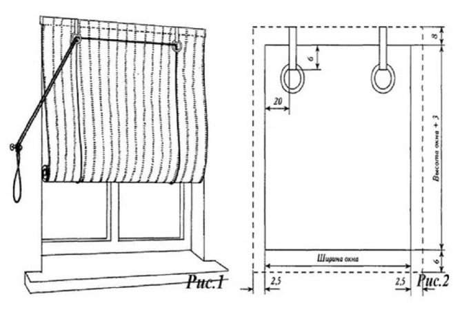 Au milieu et aux extrémités de chaque tige, des anneaux en plastique ou en métal sont cousus, des lacets sont passés à travers eux, qui sont attachés à la corniche. En tirant sur ces lacets, le rideau peut être relevé par division - d'une tige à l'autre.