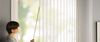 - Verticale. Les bandes de tissu sont fixées en haut et tournées à différents angles. Vous pouvez ouvrir l'ouverture de la fenêtre en les faisant glisser dans n'importe quelle direction. Plusieurs modes de montage sont possibles: au plafond, au-dessus de l'ouverture de la fenêtre ou à l'intérieur.