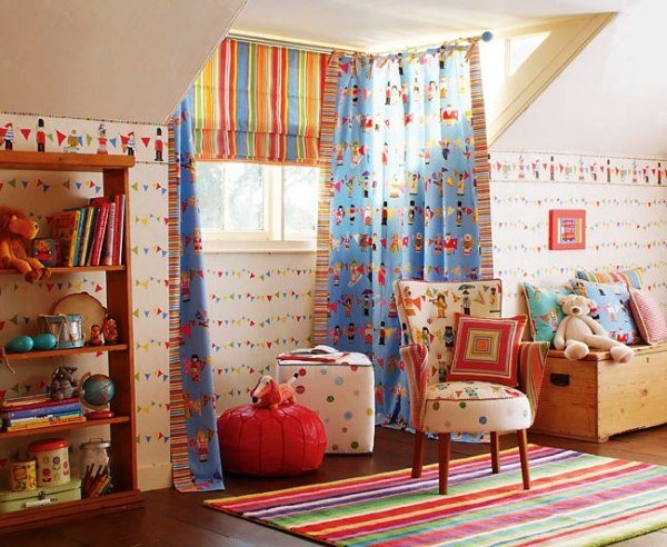 Pour une chambre d'enfants, les stores originaux avec applications seront une solution idéale. Différents patchs peuvent être achetés au magasin et cousus sur la base en tissu du rideau. Il existe également des types de patchs qui suffisent à cuire à la vapeur avec un fer à repasser.
