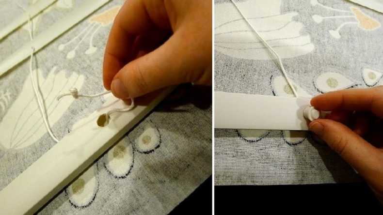 Des planches sont insérées dans les poches, qui sont formées en cousant la tresse le long des lignes marquées. Le rideau se lève verticalement à l'aide de lacets en nylon. Les cordons sont ajustés avec des anneaux cousus à la tresse dans le même sens. Les stores en tissu sont relevés en fixant les cordons avec des faisceaux au bas du mécanisme. Les anneaux supérieurs sont accrochés à la corniche. Ensuite, les lacets doivent être sortis d'un côté, le long de tous les anneaux supérieurs. Le mouvement des stores est limité par la fixation des cordons. Pour ce faire, un support ou un crochet est cloué au mur.