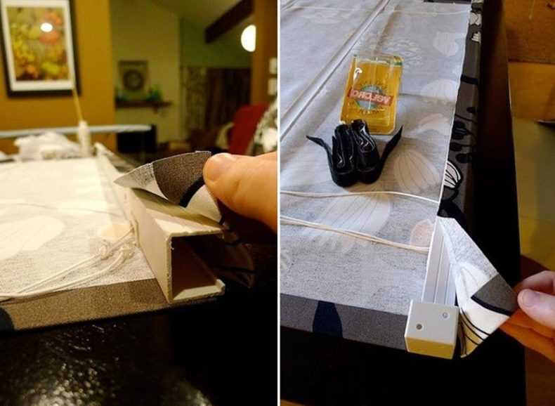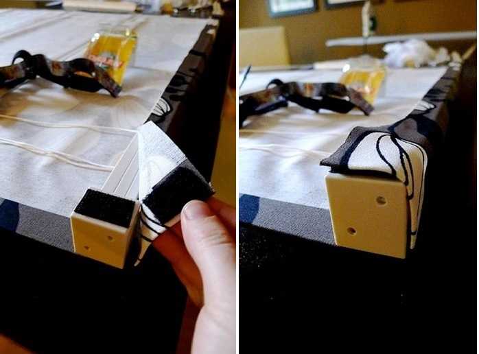 - S'il a été fourni, masquez ce bloc avec une toile à l'aide d'une bande Velcro. Si cette option a été manquée, la toile du rideau le long du bord est fixée à la barre à l'aide d'une agrafeuse de construction.